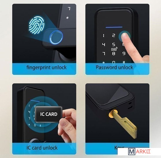 Электронный, биометрический замок. Открытие замка - отпечатком пальца, паролем, ключом, картой. Программируется на 100 отпечатков пальцев и паролей. Сохраняет работоспособность при температуре от -25С до +50С. Заряда батареек хватает более чем на год. Есть функция уведомления при разряде. Замок работает от 4 батареек типа АА.Реверсная дверная ручка для установки с правой/левой стороны. TUYA приложение на русском языке. Удаленная разблокировка. Дистанционный мониторинг-просматривайте журнал активности посетителей, которые входили/выходили в ваш дом. Встроенная защитная сигнализация от демонтажа.