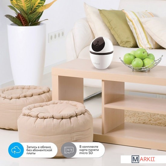 Следить за обстановкой в доме 24 часа в сутки помогает поворотная камера rubrtek. Даже при съемке в полной темноте вы получаете четкое видео в FullHD разрешении. В камере реализован охранный режим на базе датчика движения. Он активизируется, как только в зону видимости попадает движущийся объект. На телефон приходит уведомление и фото нарушителя. Даже если злоумышленник полностью обесточил дом, камера еще 3 часа работает на резервном питании. Ваше имущество под надежной защитой.