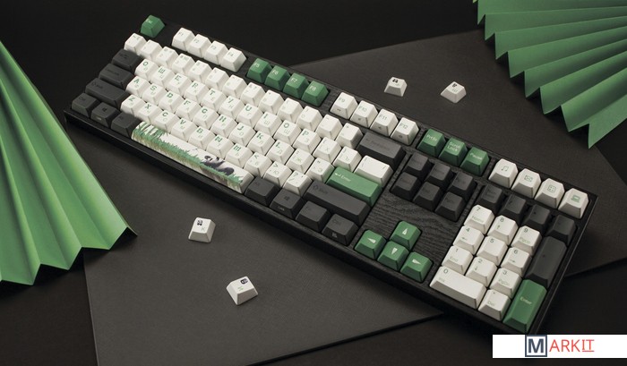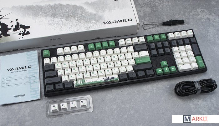 Varmilo — яркая звезда на небосводе китайских производителей клавиатур. Смазанные стабилизаторы, ручная сборка, эстетичный дизайн - каждая клавиатура Varmilo как произведение искусства. Если панда - символ удачи, то с этой клавиатурой вы обречены на успех во всех делах. А зеленый цвет капов, как лучший зеленый чай из провинции Чжэцзян, сделает вас непобедимым.В обновлённой версии клавиатура получила USB Type-C порт вместо Mini-USB. Он спрятан в центре под корпусом, а на самой клавиатуре имеются центральная и две боковые канавки под кабель.Кейкапы V-SilkИзготовлены из прочного PBT пластика с применением dye-sublimation технологии и выгравированными символами на боках. Клавиши гладкие и приятные на ощупь, меньше пачкаются, а символы не стираются и не чувствуются при печати.Из-за особенности производства символы на клавишах могут быть расположены с небольшим сдвигом.Стабилизаторы, смазанные на заводеСочетание стабилизаторов и смазки делает ход клавиш enter, space, shift, backspace равномерным и плавным.Белая подсветкаИмеет 3 режима: выключена, статичное свечение, эффект затухания, и 4 уровня яркости.Режимы меняются через FN + стрелка вправо, FN + стрелка вверх/вниз меняет яркость в режиме статичного свечения и скорость в режиме затухания.Вместо заводской белой подсветки можно установить кастомную подсветку другого цвета.Мультимедиа и дополнительные FN функцииКлавиатура поддерживает сочетания клавиш для регулировки громкости и управления музыкой. Также можно отключить кнопку windows и поменять клавиши Fn и Win/Ctrl и Caps Lock местами.Регулируемые ножкиПрочные регулируемые ножки позволят приподнять клавиатуру и изменить угол наклона для комфортной печати, а прорезиненный низ не даст клавиатуре сдвинуться с места.Клавиатура совместима с Mac OSМультимедиа и дополнительные FN функции совместимы с MAC OS и работают как полагается, а поменять местами клавиши-модификаторы можно в системных настройках. Дополнительные мультимедиа клавиши в правой части клавиатуры не работают с Mac OS.Проверено с MAC OS 10.13. Функция Full N-key Rollover по USB (NKRO)Позволяет нажимать одновременно неограниченное количество клавиш. Удобно в игре, когда нужно прожимать многокнопочные комбинации.Осторожно, старые BIOS-ы могут не реагировать на клавиатуру из-за NKRO.