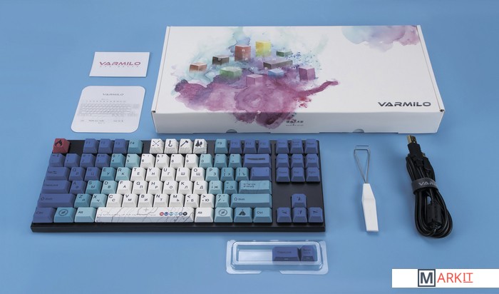 Комплект поставки Клавиатура;Коробка;Крышка для защиты от пыли;Varmilo wire keycap puller – позволит легко снять кейкапы с клавиатуры;USB Type-C кабель с велкро застежкой;Инструкция;