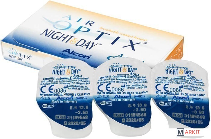 Контактные линзы Air Optix Night & Day обладают максимальной кислородной проницаемостью, их можно носить не снимая в течение 30 суток.Air Optix Night & Day Aqua пропускают в 6 раз больше кислорода к роговице, чем обычные гидрогелевые линзы, и обеспечивают постоянно высокий уровень кислорода в роговице в течение всего периода ношения контактной линзы.Линзы Air Optix Night & Day Aqua содержат малое количество воды, поэтому не вызывают ощущения сухости в конце дня.Данные контактные линзы не вызывают побочных негативных явлений, таких как дискомфорт и залипание линз после сна в линзах или принятия душа в них, усталость глаз после ношения линз более 12 часов в день, сухость слизистой глаз после работы с компьютером и в помещениях с сухим воздухом.При пользовании силикон-гидрогелевыми контактактными линзами Air Optix Night & Day Aqua уменьшается риск инфицирования, связанного с контаминацией и неправильным уходом за линзами.