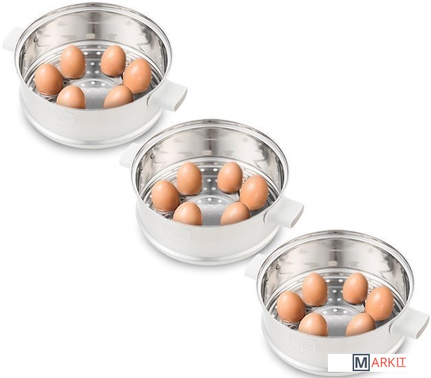 Дополнительные принадлежности в трех емкостях есть углубления для варки яиц