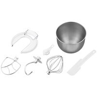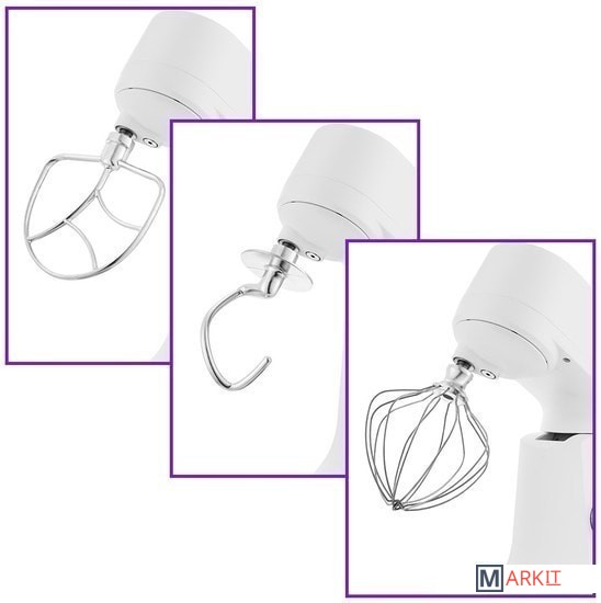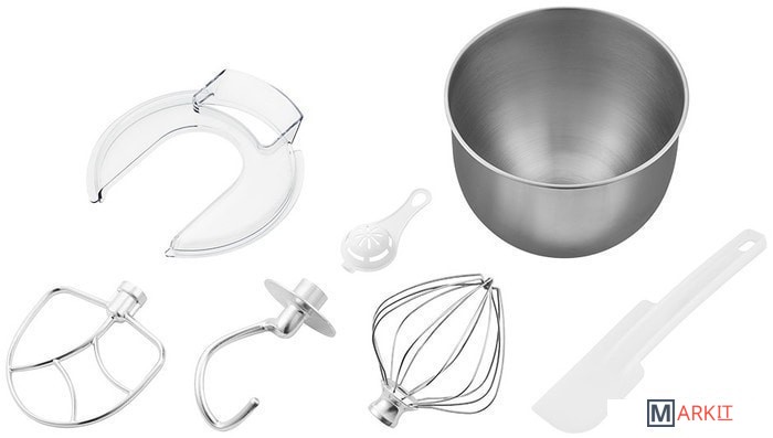 Полная комплектация Планетарный миксер.Насадка для смешивания.Насадка-венчик.Крюк для теста.Защитная крышка на чашу.Лопатка.Сепаратор для яиц.